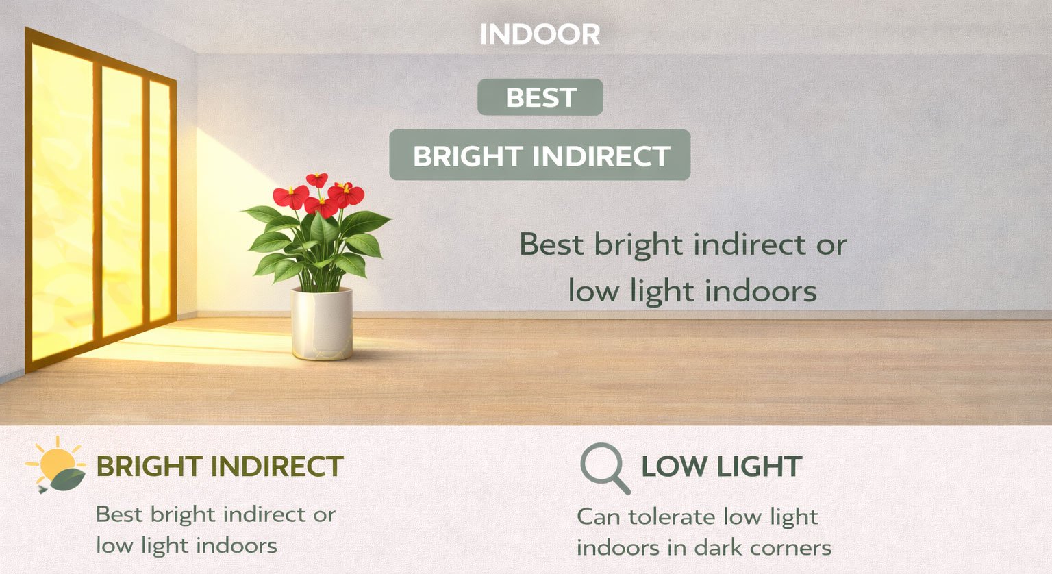 Anthurium Red performs best indoors near bright windows with filtered or indirect sunlight. It can also be placed in shaded balconies or verandas.