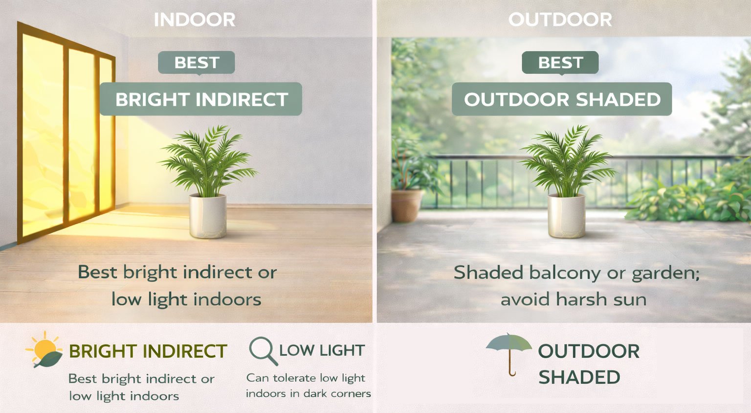 This palm performs well indoors near bright windows with indirect light. Outdoors, it thrives in shaded balconies, verandas, or garden areas with filtered sunlight.