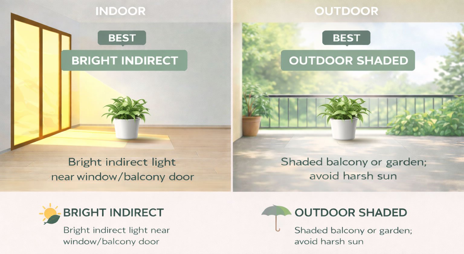 This plant performs best indoors or in shaded outdoor areas with filtered light. Direct sunlight should be avoided, as it can quickly damage the delicate leaves.